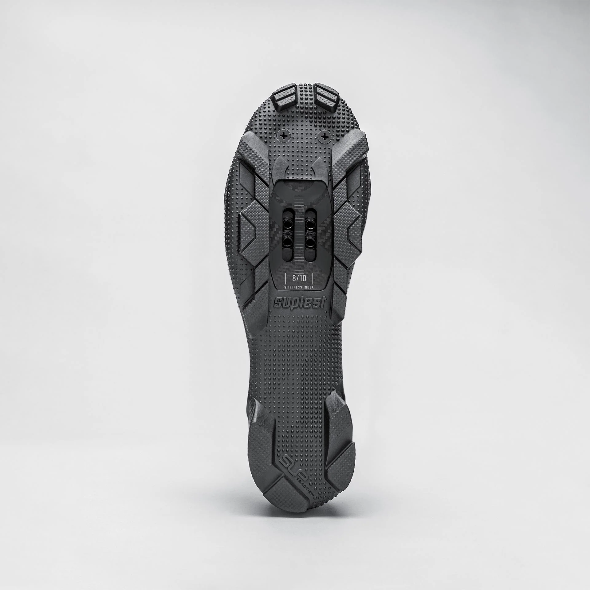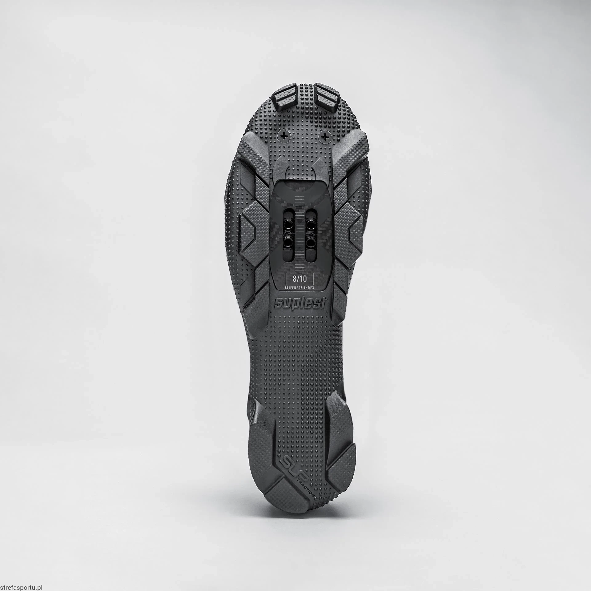 Optymalna interakcja podeszwy z włókna węglowego z mieszanką gumową SUPtraction Ta podeszwa jest efektem współpracy z SUPtraction. Zastosowaliśmy w niej przyczepny profil gumowy, który zapewnia doskonałą przyczepność w terenie. Sztywny rdzeń z włókna węglowego stanowi podstawę bezpośredniego przenoszenia mocy na pedał.