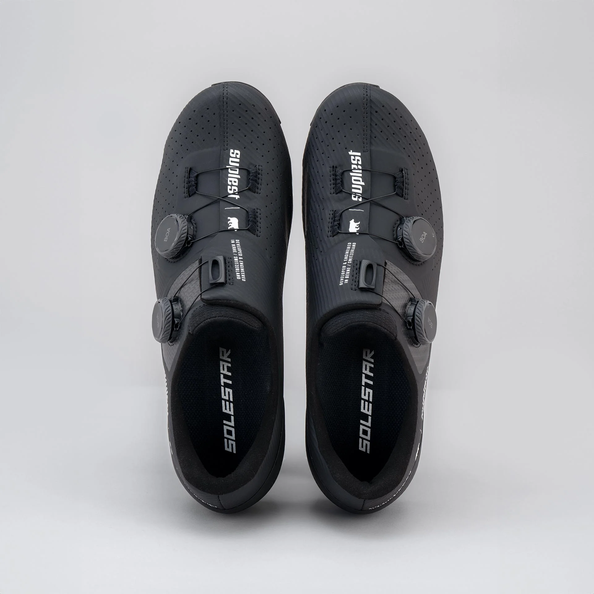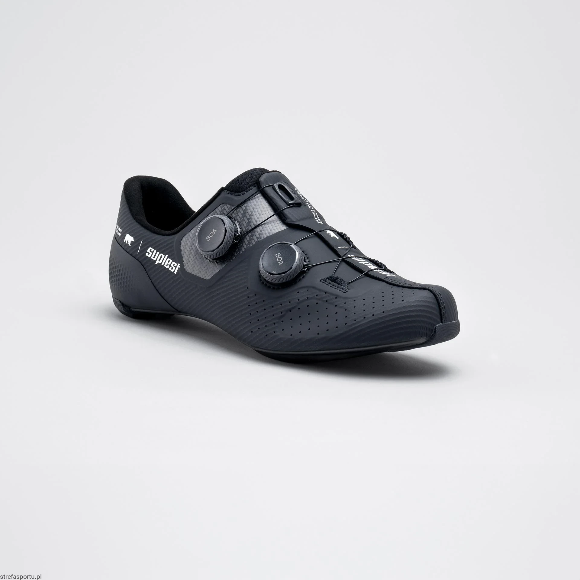 Zaprojektowane, aby sprostać wymaganiom najlepszych kolarzy, ROAD PRO to nasz flagowy, wysokowydajny but szosowy, stworzony do intensywnego ścigania i zaprojektowany tak, aby przekroczyć oczekiwania najlepszych sportowców na świecie. Cholewka ma konstrukcję warstwową, łączącą podstawę z siateczki 3D z cienką warstwą TPU, która zapewnia wysoki poziom komfortu, oddychalności i trwałości. Ta unikalna konstrukcja zapewnia elastyczność, a jednocześnie stabilność, idealną do jazdy o wysokiej intensywności. Nasz ROAD PRO ma strefę FLEX ZONE w przedniej części stopy, strategicznie zaprojektowaną, aby zwiększyć komfort i zmniejszyć zmęczenie podczas pedałowania z dużym naciskiem, pozwalając kolarzom zachować moc na długich dystansach. Aby zapewnić idealne dopasowanie, podwójny system BOA® Fit System Li2 oferuje mikroregulację, umożliwiając szybkie i dokładne dopasowanie. W połączeniu z zapiętkiem 3D zapewnia precyzyjne mocowanie stopy, minimalizując poślizg i zwiększając stabilność dla maksymalnej wydajności.Specjalnie stworzone, najdoskonalsze kopyto kolarskie jest rdzeniem naszych butów i zostało zaprojektowane dla kolarzy nastawionych na wydajność. Jest tak specyficzny i wyjątkowy, że stanowi prawdziwy ślad stopy suplest. Koncepcja ERGO 360° opiera się na naszym ostatnim modelu, definiując kształt i dopasowanie naszych butów.
