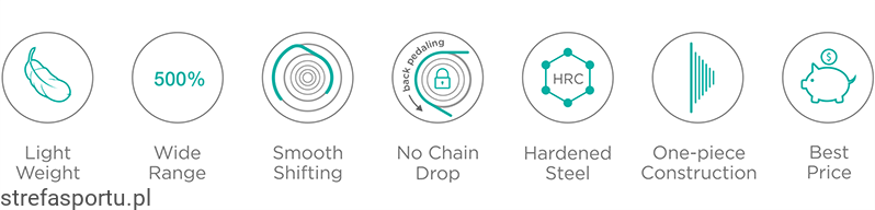 - Przekładnie kasetowe 10-12-14-16-18-21-24-28-32-36-42-48 (10-48T), 10-12-14-16-18-21-24-28-32-36-42 -50 (10-50 T), 10-12-14-16-18-21-24-28-32-37-44-52 (10-52 T)