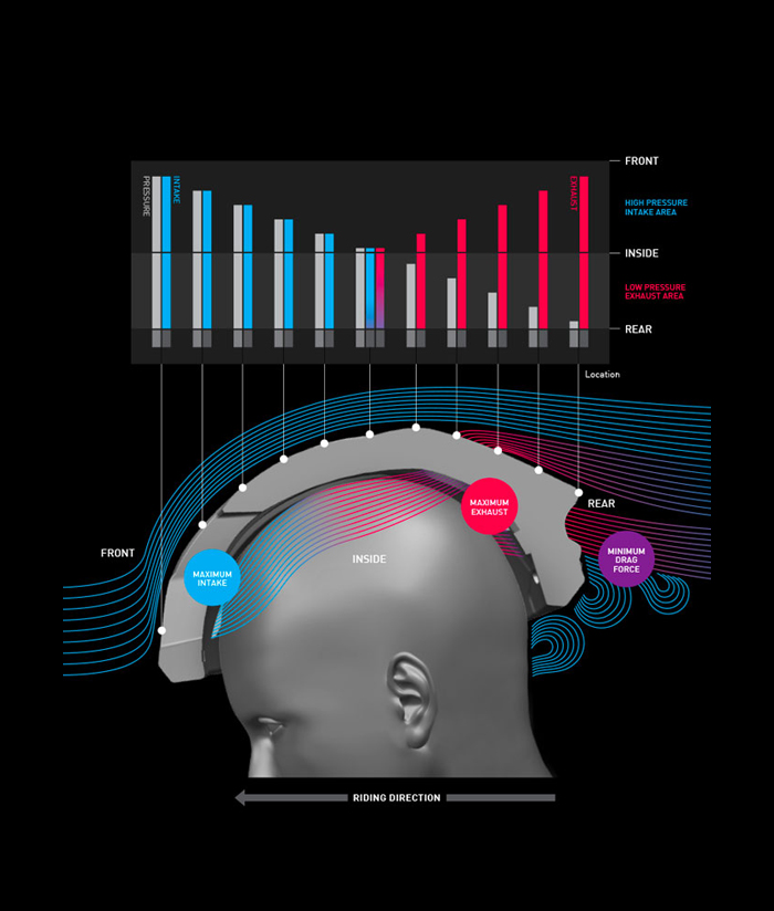 Ventury DynamicsAby osiągnąć maksymalną wentylację, w modelach HJC o ulepszonych właściwościach aerodynamicznych zastosowano techniczną adaptację zasady Bernoulliego. W ruchu szybkość przepływu powierzchniowego na ogół wzrasta wraz z postępem w kierunku tylnej części kasku. Dzięki różnicom ciśnień chłodne powietrze z przedniego wlotu jest wyciągane przez tylny otwór wentylacyjny w celu wewnętrznego rozpraszania ciepła, zapewniając rowerzyście optymalną wentylację i doskonały przepływ powietrza podczas jazdy. |