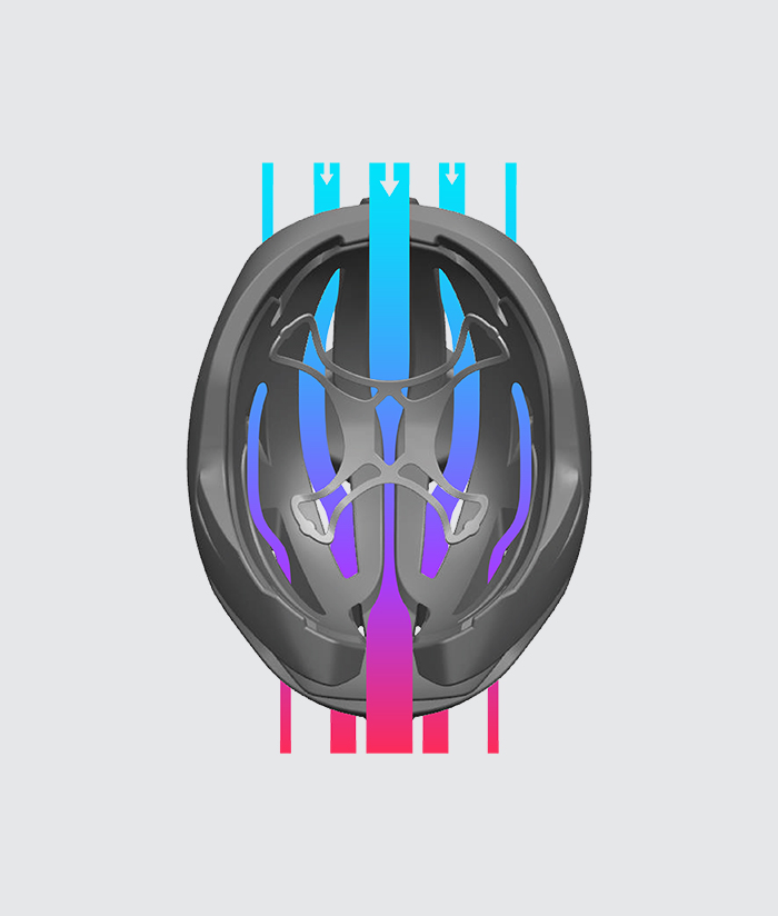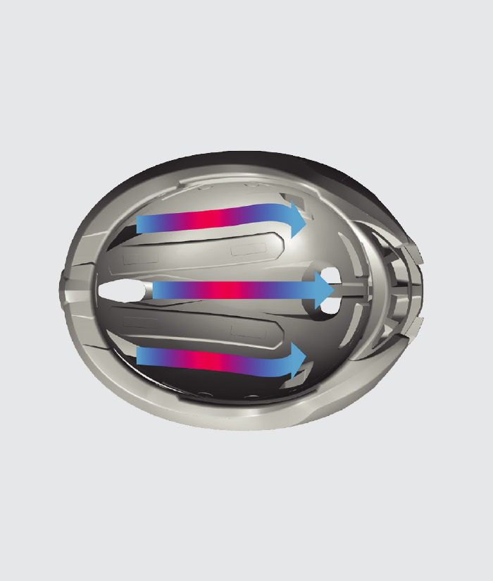 Zaawansowany system kanałów powietrznychPewna ilość powietrza przepływa przez przedni port wlotu powietrza, następnie krąży wewnątrz kasku i ostatecznie wypływa przez otwór wylotowy. Następnie zwiększa się wewnętrzny przepływ powietrza, aby schłodzić głowę i odprowadzić ciepło. |