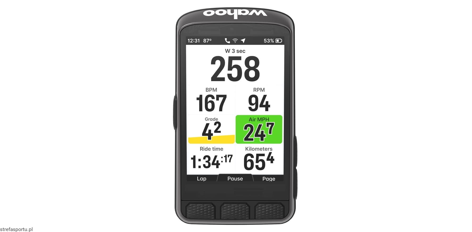 Najlepszy ekran w swojej klasie: Małe ekrany charakteryzujące się słabą czytelnością nie mogą zapewnić takiej samej klarowności jak smartfony, dlatego też ELEMNT ACE wyposażono w największy ekran spośród wszystkich komputerów rowerowych dostępnych na rynku. ACE, wyposażony został w 3,8-calowy ekran w proporcji 3:2. Wyświetlacz wykonano w technologii cienkowarstwowych tranzystorów (TFT). Szeroki współczynnik proporcji ekranu pozwala na lepsze widzenie peryferyjne mapy w porównaniu do standardowych ekranów. Ekran o wysokiej wartości DPI charakteryzuje się doskonałymi właściwościami antyrefleksyjnymi, oferując krystalicznie czysty obraz i doskonałą czytelność w zmiennych warunkach pogodowych. Najnowsza technologia ekranu maksymalizuje czytelność, zapewniając praktycznie nieograniczoną paletę kolorów.