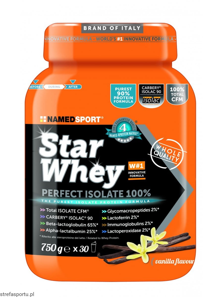 CARBERY® Isolac 90 serwatka o najwyższej jakości, uzyskana przez mikrofiltrację CFMTM o przepływie krzyżowym, gwarantująca maksymalną czystość. STAR WHEY PERFECT ISOLATE zawiera najbardziej kompletny profil aminokwasowy oraz ekskluzywny opatentowany NAMED 4 PROTEIN MATRIX®, oparty na proteazie, ekstrakcie z kozieradki i siarach bydlęcych, który zwiększa biodostępność, poprawia strawność i wchłanianie serwatki. Zawiera pełny profil aminokwasów w porcji (2 g) i najwyższą wartość biologiczną białka (119BV).