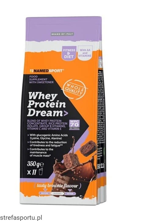 Skład: Białkowy suplement diety z enzymami i witaminami. Ze słodzikiem. Smaczny smak brownie. Składniki: Koncentrat białka serwatkowego (mleko), izolat białka ryżowego (zawiera soję), L-glicyna, kakao o obniżonej zawartości tłuszczu (5,8%), chlorowodorek L-lizyny, L-alanina, aromaty, substancje zagęszczające: guma ksantanowa, guma guar; substancja słodząca: sukraloza; Witamina C (kwas L-askorbinowy), Witamina E (DL-alfa-tokoferol), Gamma-oryzanol, kompleks enzymów z substratu roślinnego, Niacyna (nikotynamid), Kwas pantotenowy (D-pantotenian wapnia), Witamina B6 (chlorowodorek pirydoksyny ), ryboflawina, tiamina (chlorowodorek tiaminy), kwas foliowy (kwas pteroilomonoglutaminowy), biotyna (D-biotyna), witamina B12 (cyjanokobalamina).