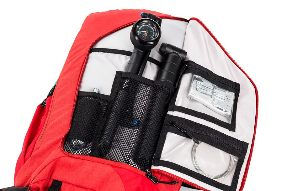 Perfekcyjne wyczucie czasu. Chmura rozrywa się i słońce prześwieca przez wierzchołki drzew na początku mojego ulubionego szlaku. Na początku wciąż płynie przez las świerkowy, ale dalej w dół staje się techniczny i stromy. W najgorszym przypadku zapasowa rura i pompka są łatwo dostępne w doskonale zorganizowanej komorze narzędziowej. A potem paskudny spadek w sednie. To dobre uczucie, wiedząc, że moje plecy są optymalnie chronione przez zintegrowany ochraniacz SAS-Tec.