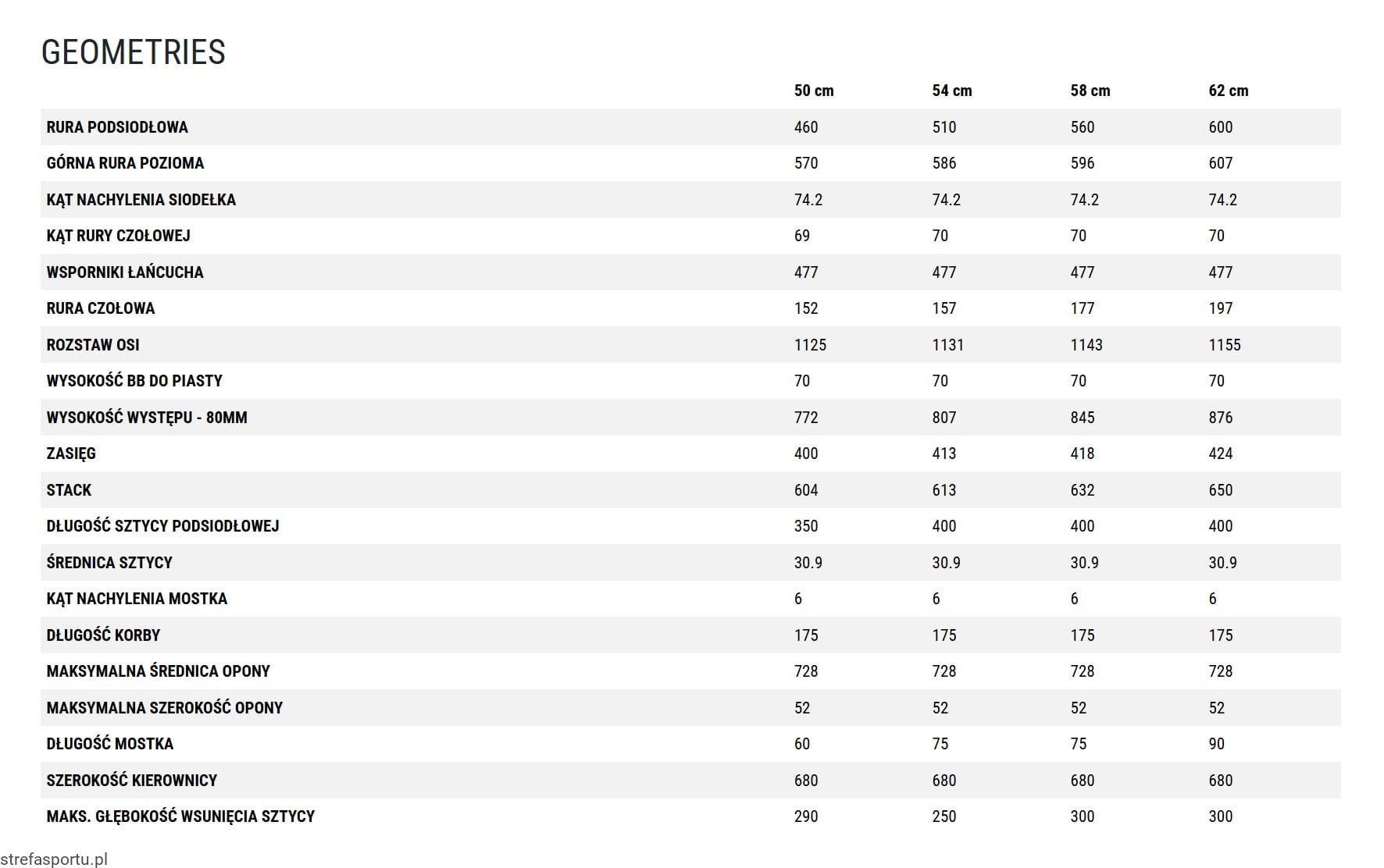 - rozmiarówka: 62 cm, 54 cm, 50 cm, 58 cm