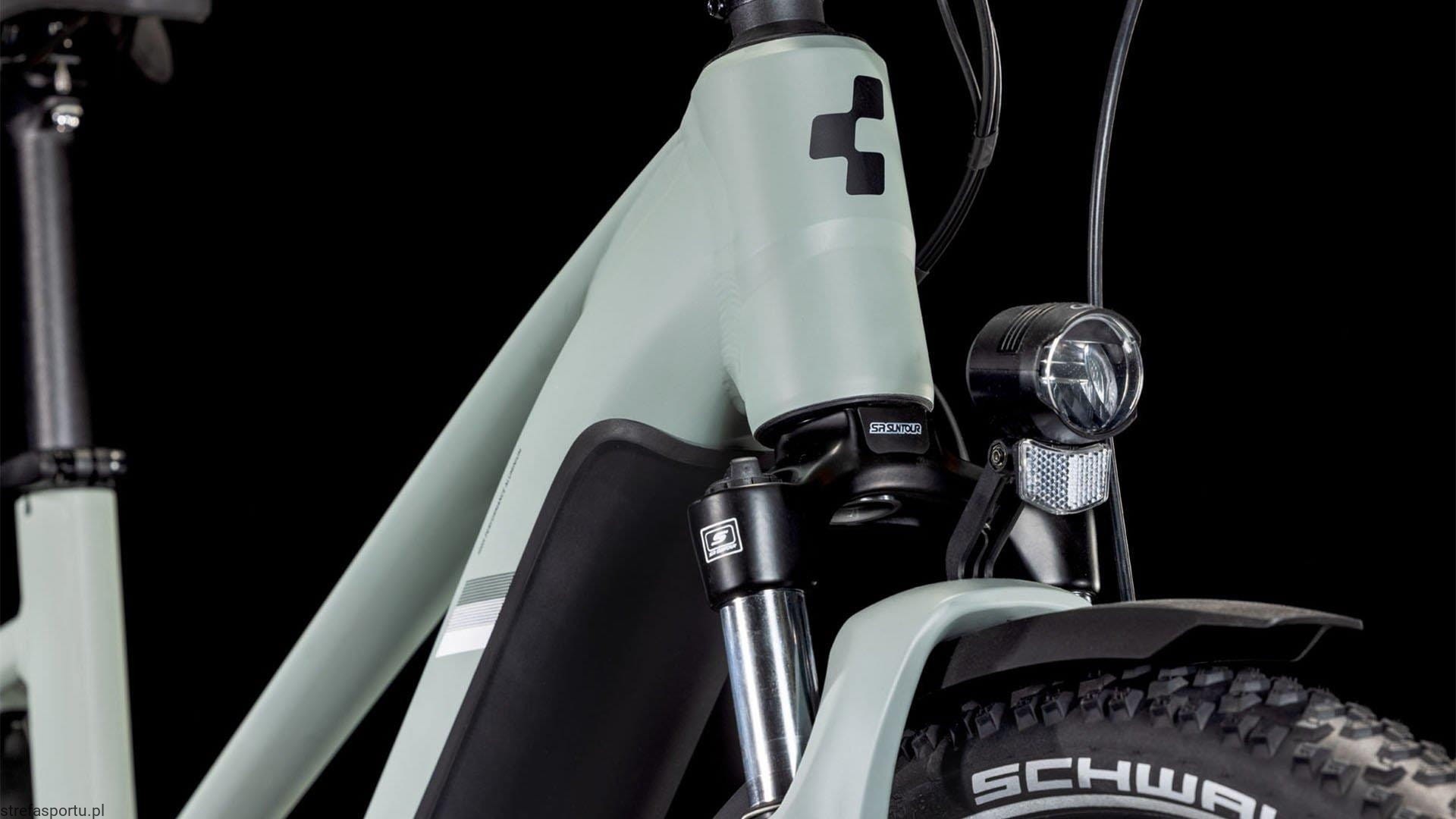 W CUBE Nuride Hybrid Performance 625 Allroad zastosowano aluminiową ramę, która zapewnia doskonałą wytrzymałość i lekkość. Amortyzacja przodu jest implementowana za pomocą widelca Suntour, co pozwala na komfortową jazdę w różnych warunkach terenowych. Rower jest wyposażony w tarczowe hydrauliczne hamulce, które oferują wysoką moc hamowania oraz kontrolę w trudnych warunkach. Koła z szerokimi oponami Maxxis Rambler EXO 45-622 gwarantują stabilność i przyczepność na szutrach oraz asfaltowych ścieżkach. Rower elektryczny jest napędzany przez silnik BOSCH Performance o mocy 75 Nm, a jego 625 Wh bateria zapewnia zasięg, który pozwala na dłuższe wyprawy.