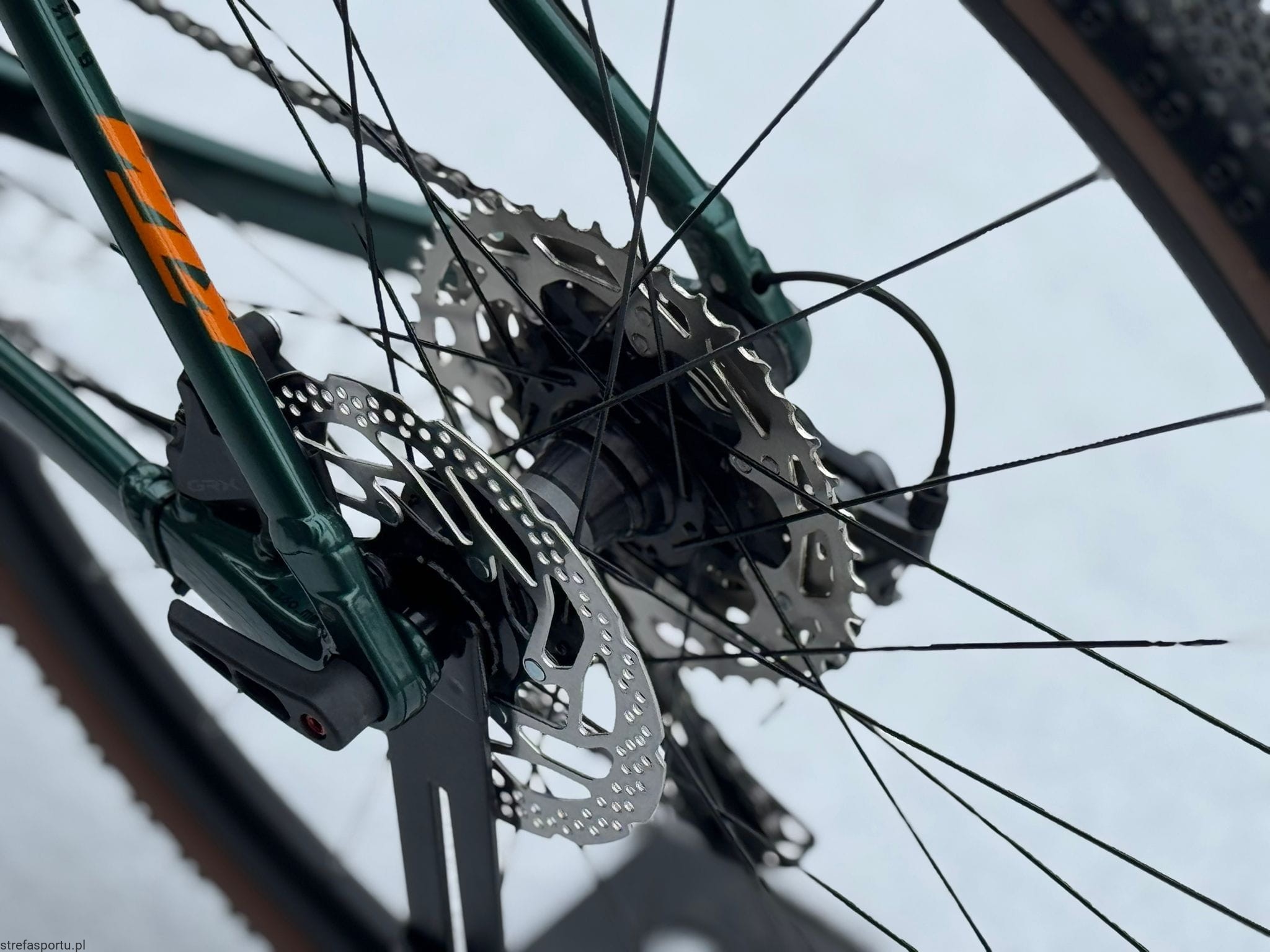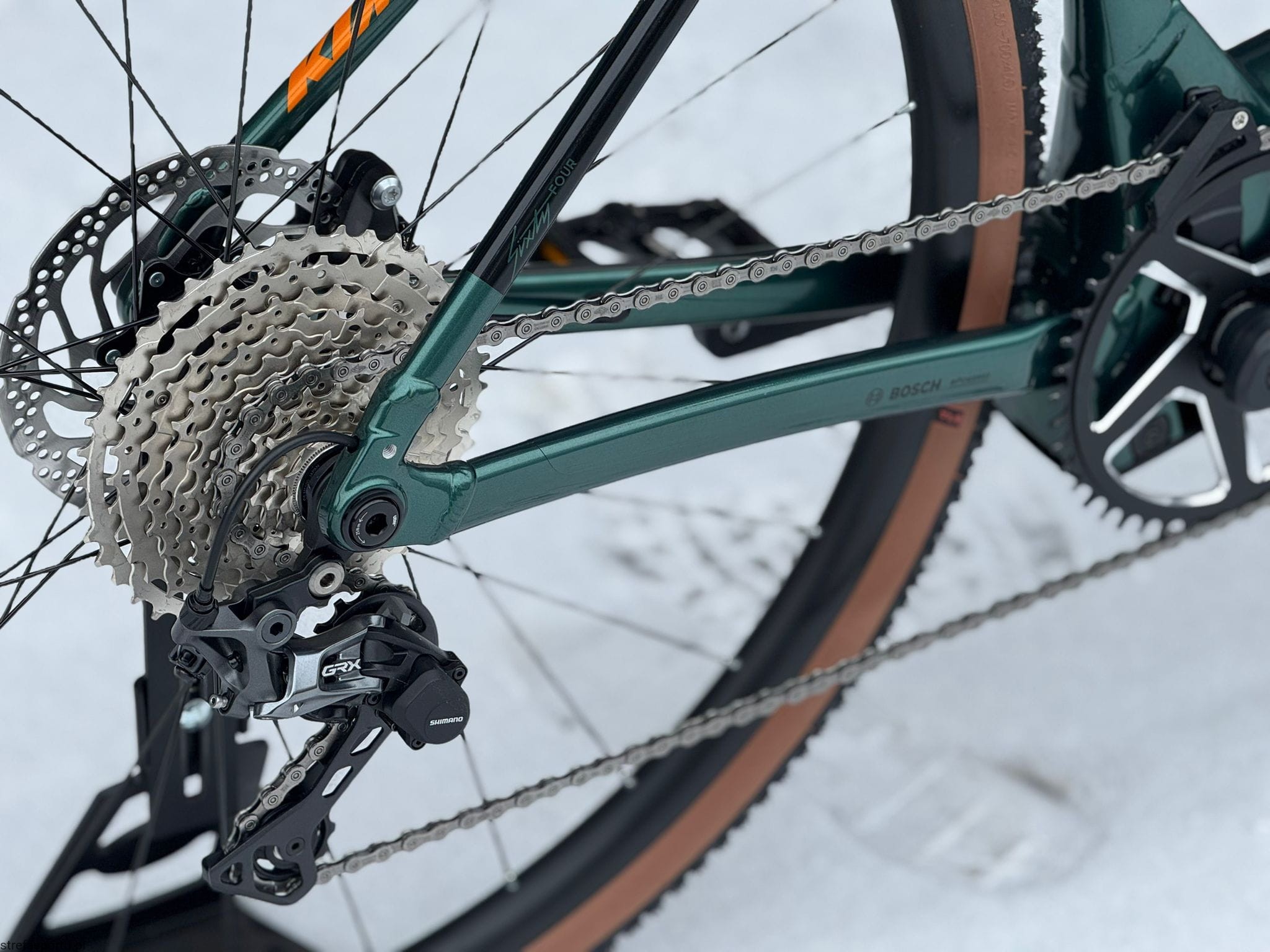 Rama roweru wykonana z aluminium zapewnia trwałość i lekkość, co przekłada się na komfort jazdy. Choć amortyzacja nie jest zastosowana, to sztywna konstrukcja ramy gwarantuje stabilność na różnych nawierzchniach. Rower wyposażony jest w tarczowe hydrauliczne hamulce, co zapewnia doskonałą siłę hamowania w każdych warunkach. Koła z oponami Schwalbe G-One Bite Perf. upewniają się, że jazda jest płynna, niezależnie od podłoża. W przypadku silnika, rower korzysta z silnika BOSCH SX o mocy 55Nm, co pozwala na efektywne wsparcie podczas jazdy. Bateria o pojemności 400 Wh zapewnia wystarczający zasięg na dłuższe trasy.
