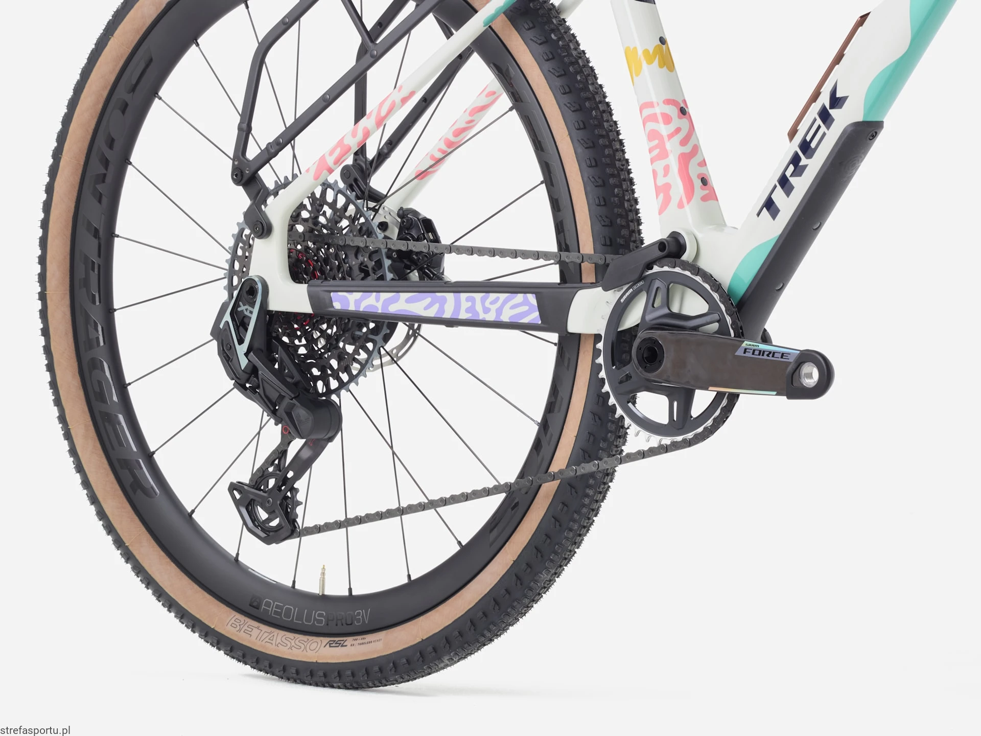 - Koło tylne Bontrager Aeolus Pro 3V, włókno węglowe OCLV, przystosowane do zastosowania bezdętkowego Tubeless Ready, szerokość obręczy 25 mm, sztywna oś przelotowa 142x12 mm