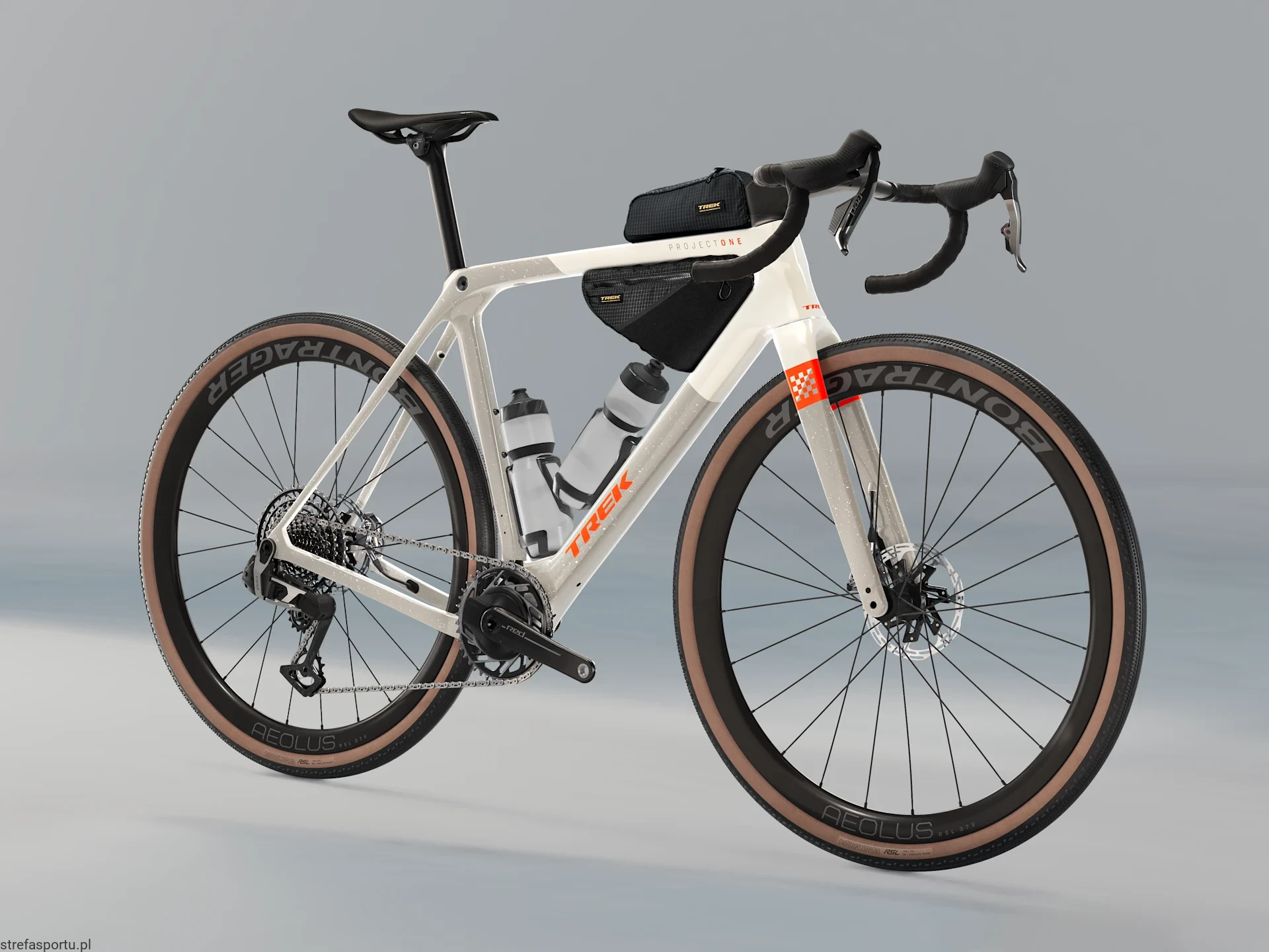 Lekka i aerodynamiczna rama z włókna węglowego OCLV serii 800 z komfortową technologią IsoSpeed oraz mnóstwem mocowań, by zabrać to, co potrzebne na wyścig. Koła z włókna węglowego Bontrager Aeolus RSL 37V oraz karbonowa kierownica z mostkiem Trek Aero RSL zapewniają lekkość i zwinność. Do tego jeszcze dodaliśmy najlżejszy i najbardziej ergonomiczny napęd SRAM RED XPLR AXS z bezprzewodowym przerzucaniem, stworzony na trudniejsze trasy.