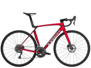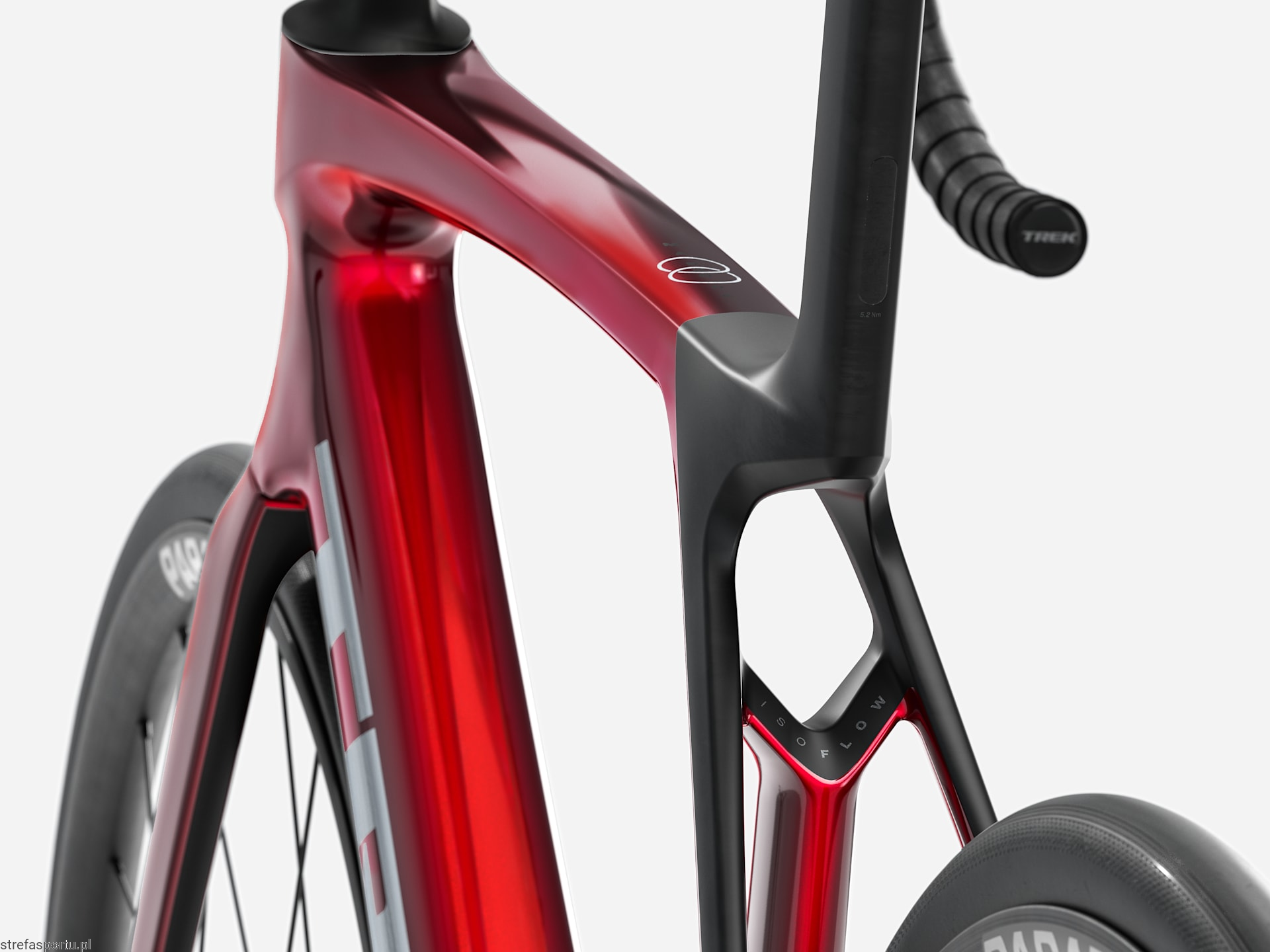 - Widelec Madone 8 w całości z włókna węglowego, zwężana rura sterowa z włókna węglowego, wewnętrzne prowadzenie przewodów hamulca, hamulce tarczowe flat mount, sztywna oś przelotowa 12 x 100 mm ze skosem