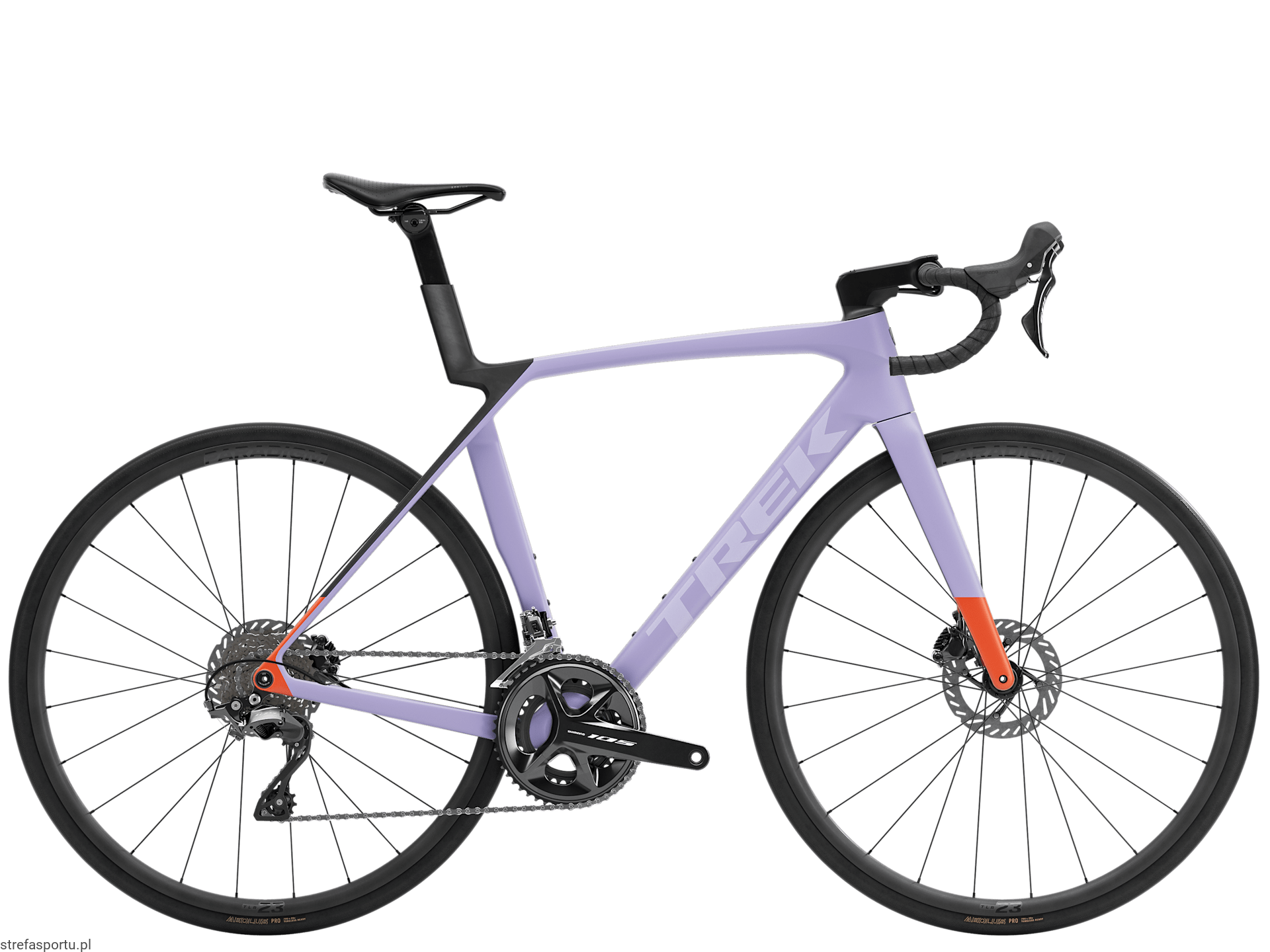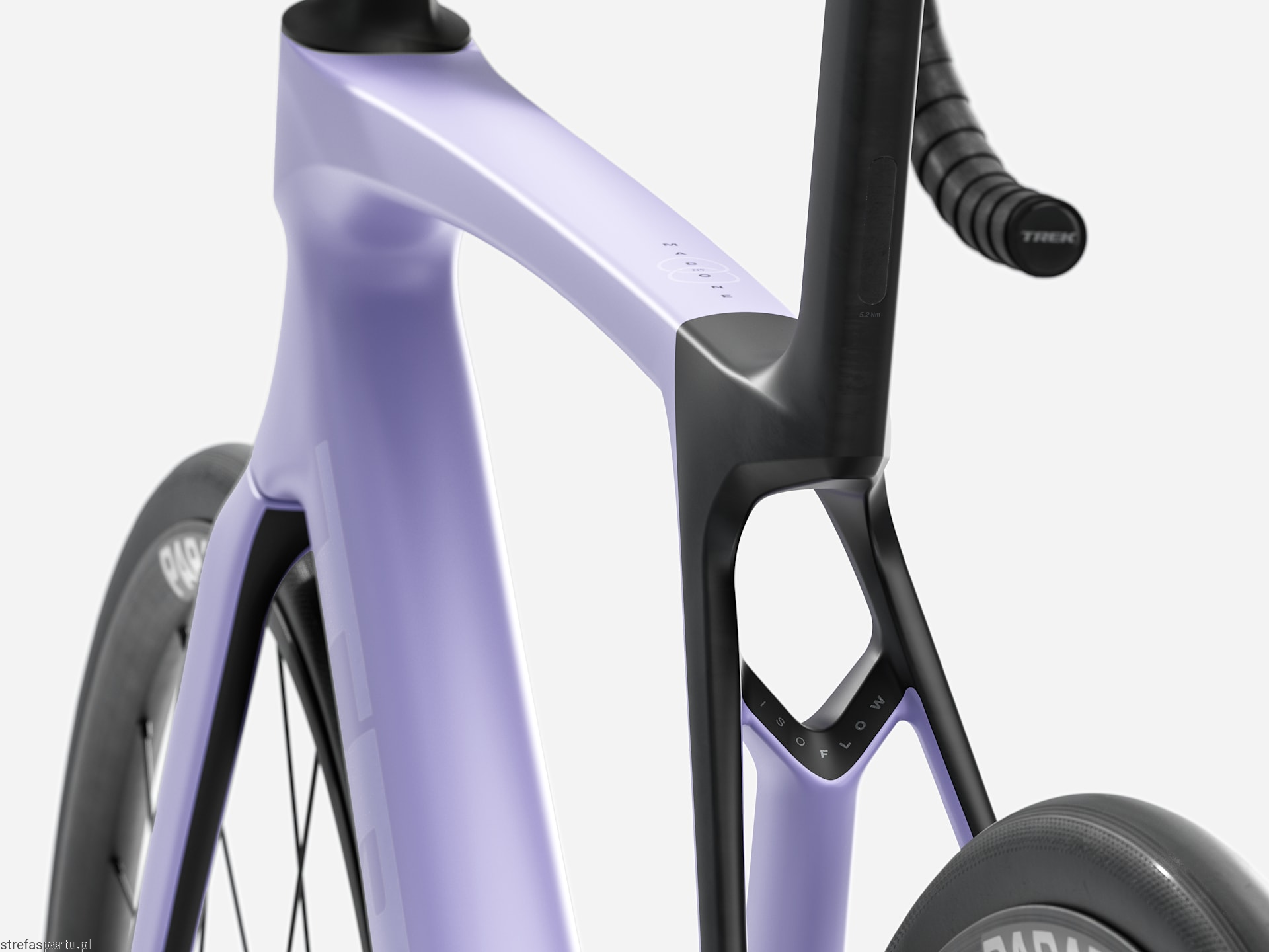 - Widelec Madone 8 w całości z włókna węglowego, zwężana rura sterowa z włókna węglowego, wewnętrzne prowadzenie przewodów hamulca, hamulce tarczowe flat mount, sztywna oś przelotowa 12 x 100 mm ze skosem
