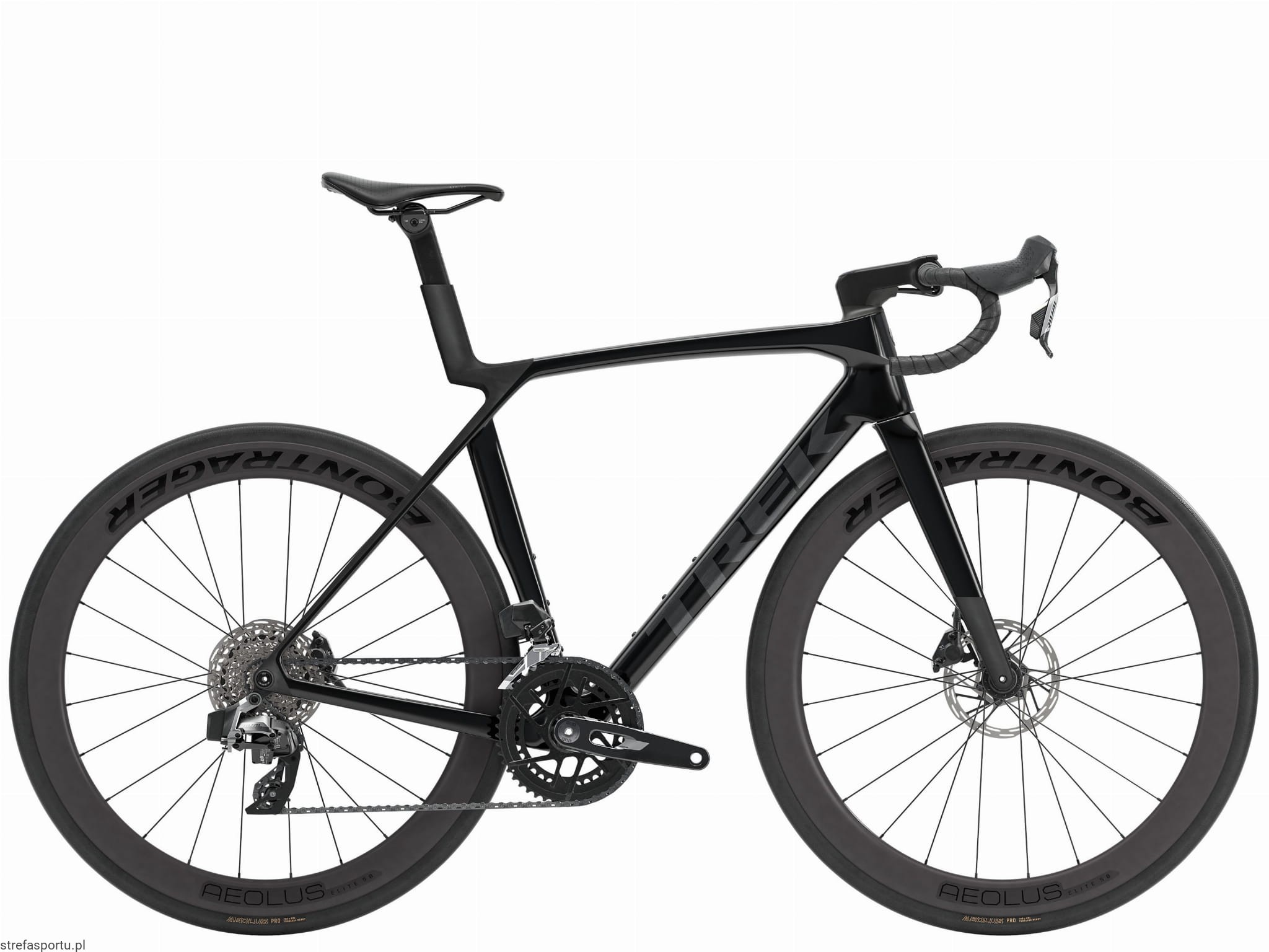 - Widelec Madone 8 w całości z włókna węglowego, zwężana rura sterowa z włókna węglowego, wewnętrzne prowadzenie przewodów hamulca, hamulce tarczowe flat mount, sztywna oś przelotowa 12 x 100 mm ze skosem
