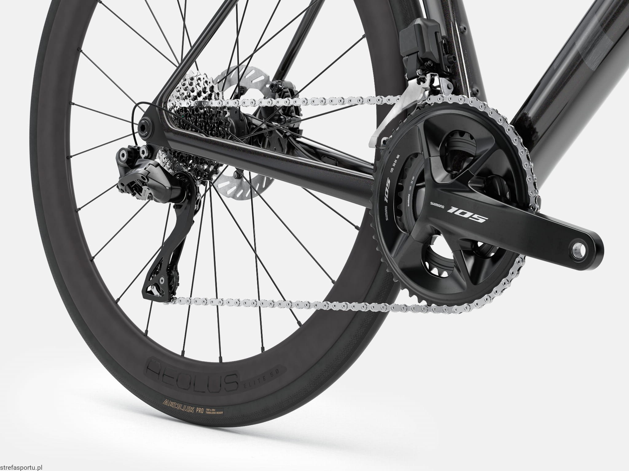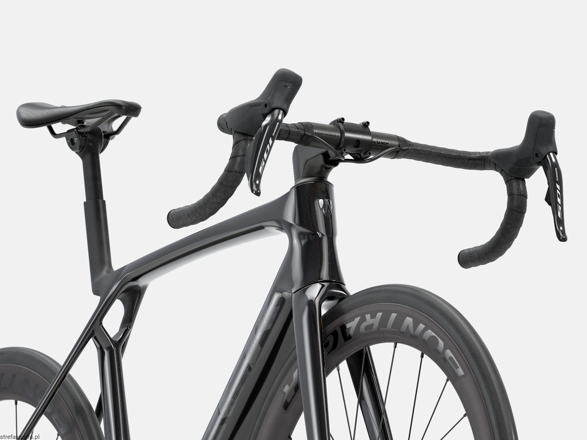 Madone SL 6 Gen 8 to lekki aerodynamiczny rower szosowy, który wprowadza elitarne technologie wyścigowe pod strzechy z bardziej przystępnym włóknem węglowym OCLV serii 500 niż wersja SLR. Sterowana elektronicznie grupa Shimano 105 Di2 gwarantuje błyskawiczną zmianę przełożeń i zamontowana jest na aluminiowej kierownicy, która utrzymuje koszty w ryzach. Całość zwieńczają koła z włókna węglowego dodatkowo wspomagające lekkość i sprawność.