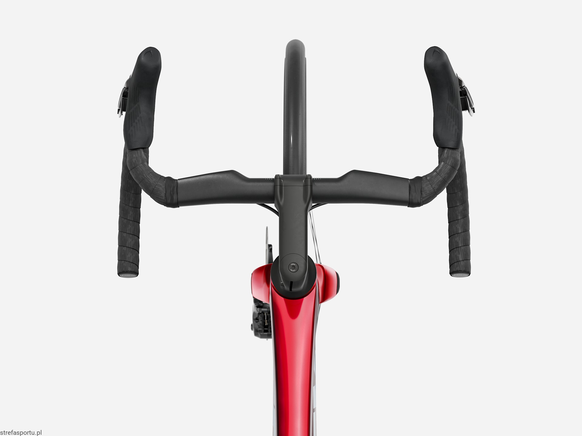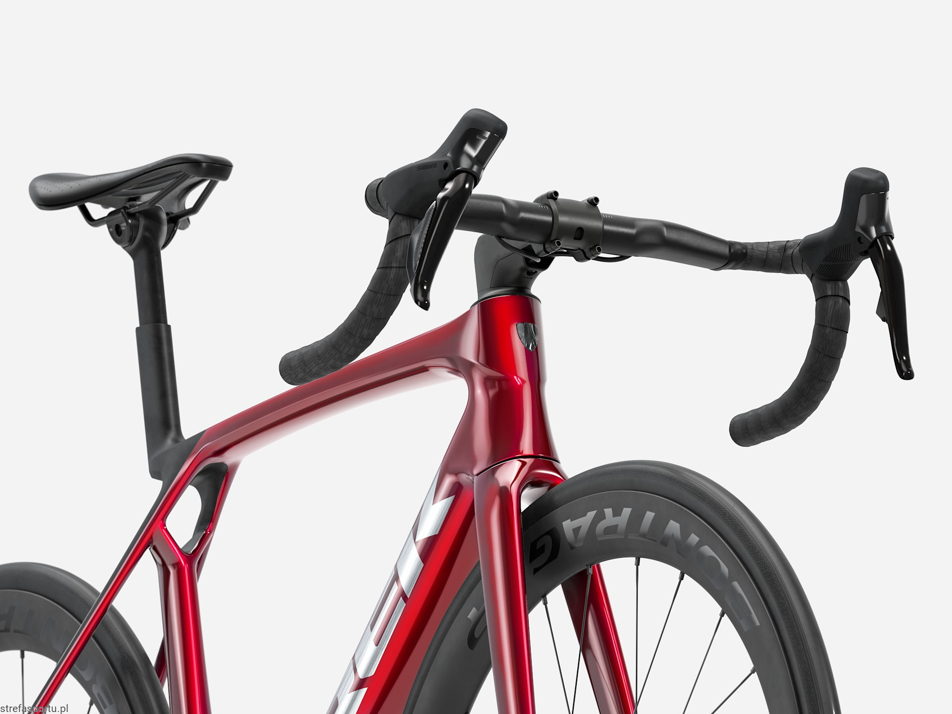 Bontrager Aero Pro, włókno węglowe OCLV, 31,8 mm, wewnętrzne prowadzenie przewodów Di2, zasięg 80 mm, zagięcie kierownicy 124 mm, szerokość przy klamkomanetkach 41 cm, szerokość 44 cm