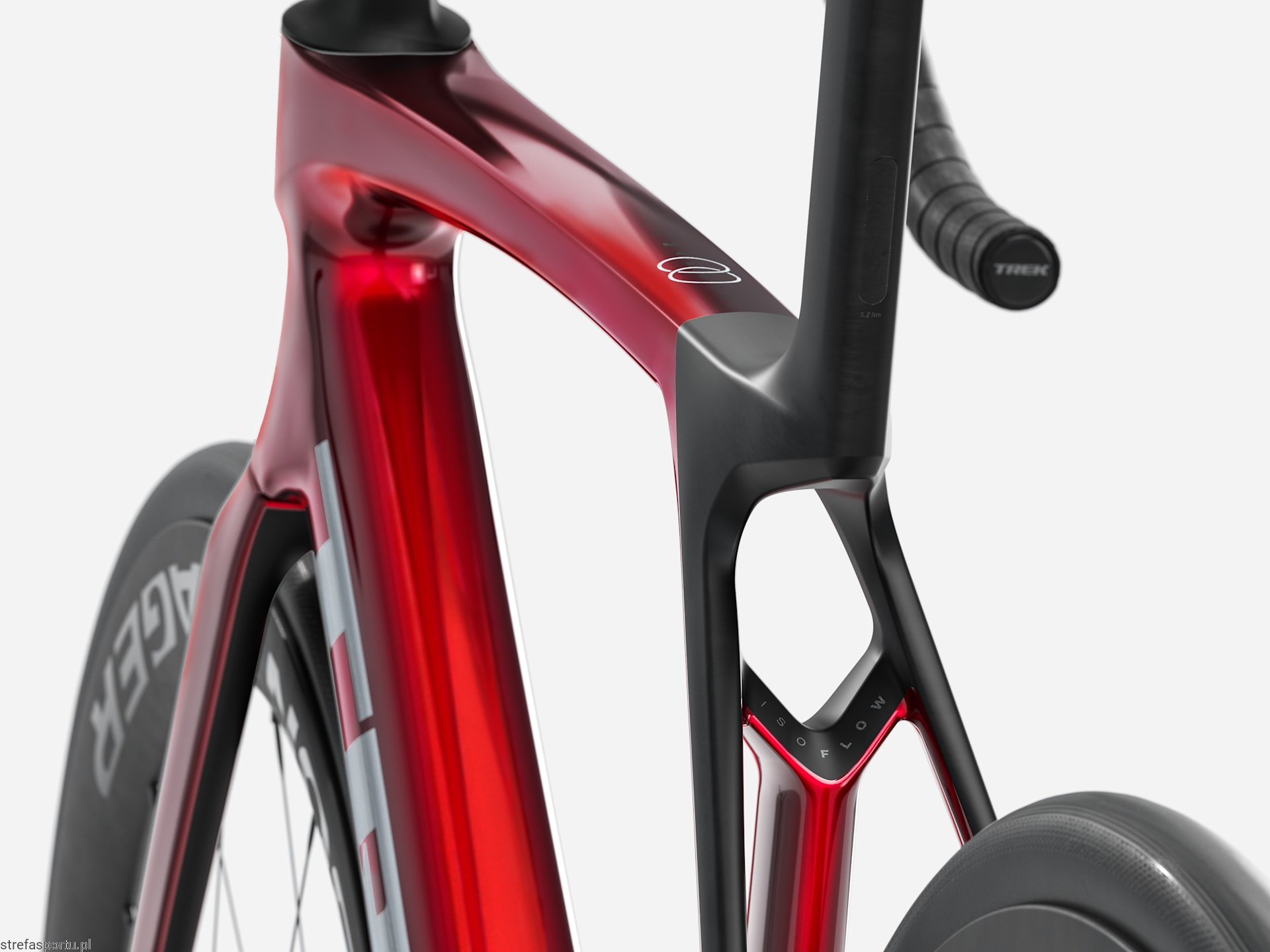 - Widelec Madone 8 w całości z włókna węglowego, zwężana rura sterowa z włókna węglowego, wewnętrzne prowadzenie przewodów hamulca, hamulce tarczowe flat mount, sztywna oś przelotowa 12 x 100 mm ze skosem