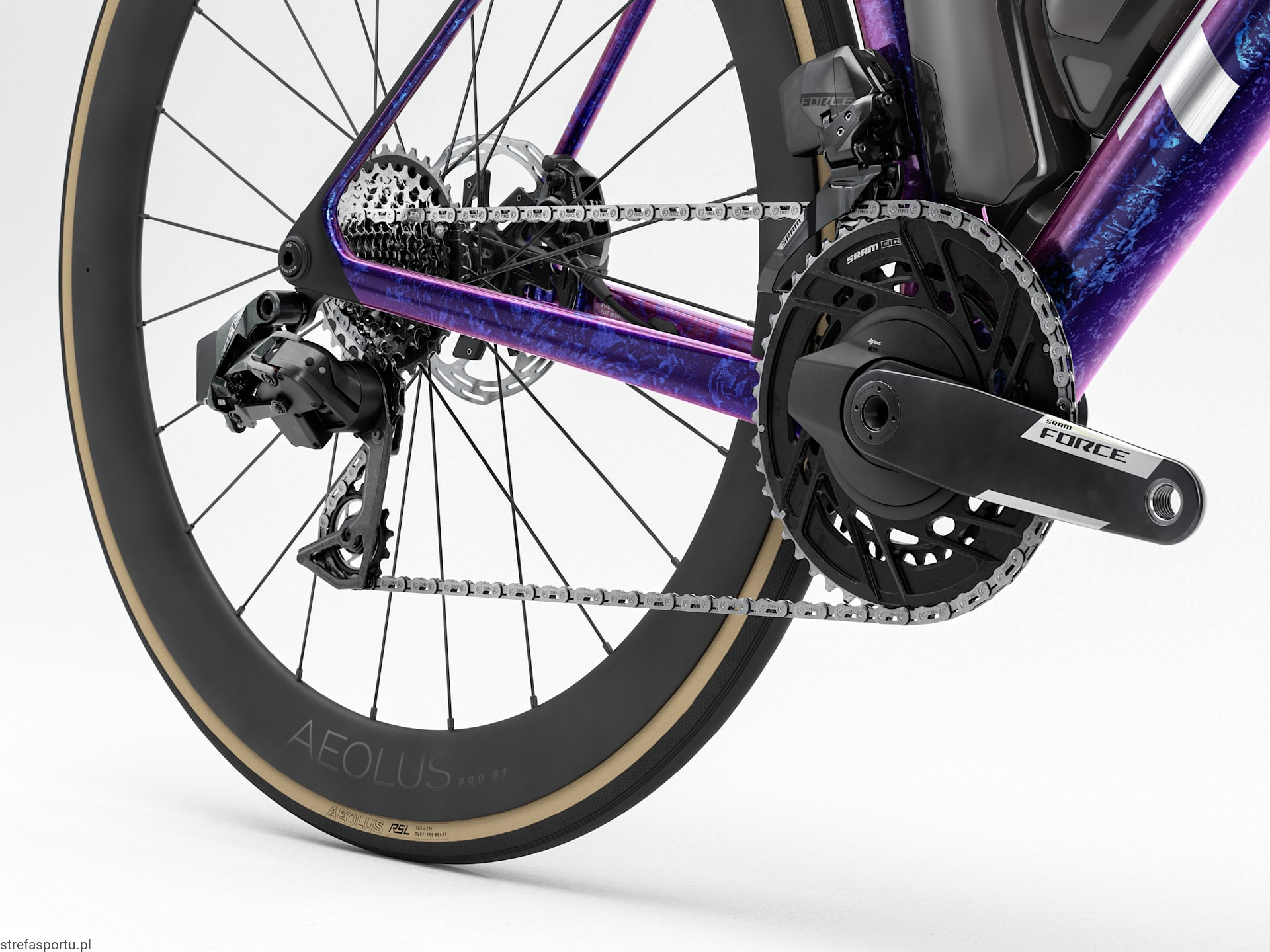 - Koło tylne Bontrager Aeolus Pro 51, włókno węglowe OCLV, Tubeless Ready, bębenek SRAM XD-R, sztywna oś przelotowa 142 x 12 mm