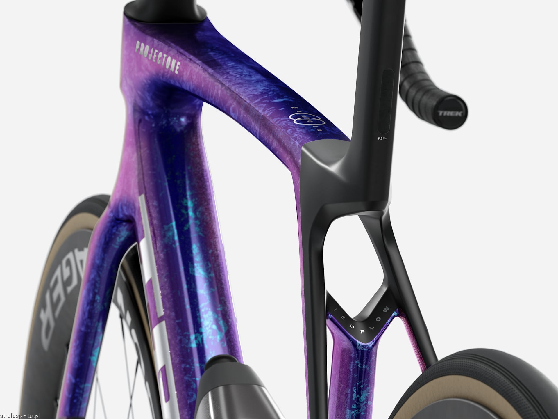 - Widelec Madone Gen 8 w całości karbonowy, zwężana rura sterowa z włókna węglowego, wewnętrzne prowadzenie przewodów hamulcowych, hamulce tarczowe Flat Mount, fazowana oś sztywna 12x100 mm