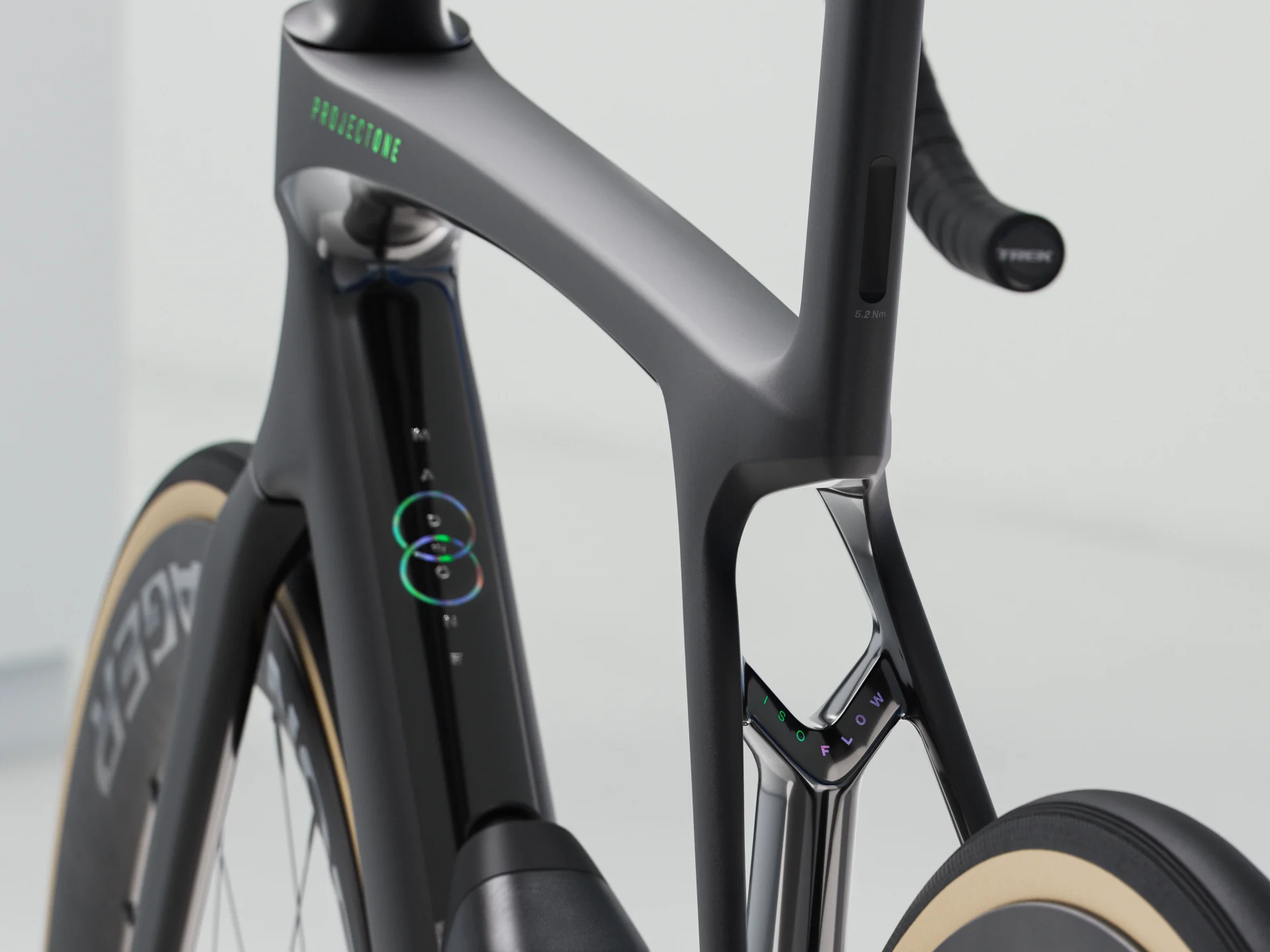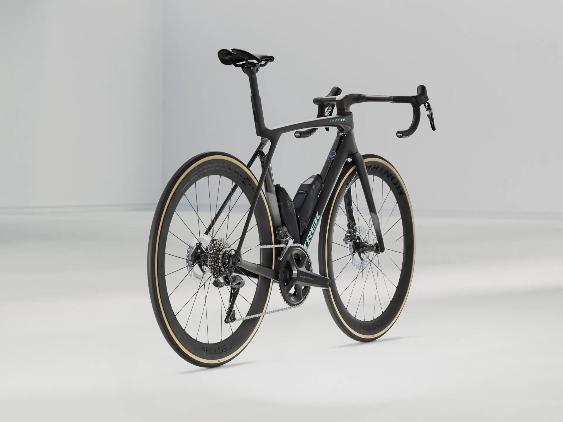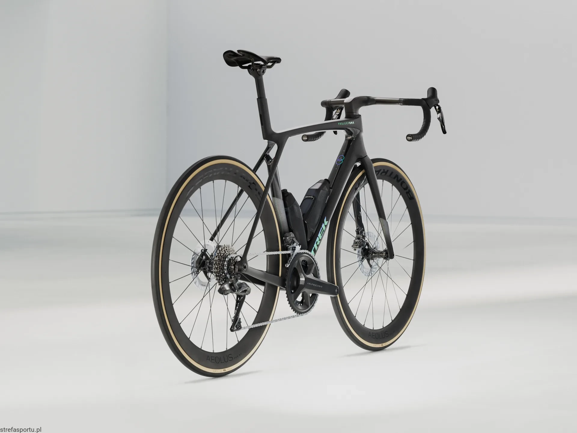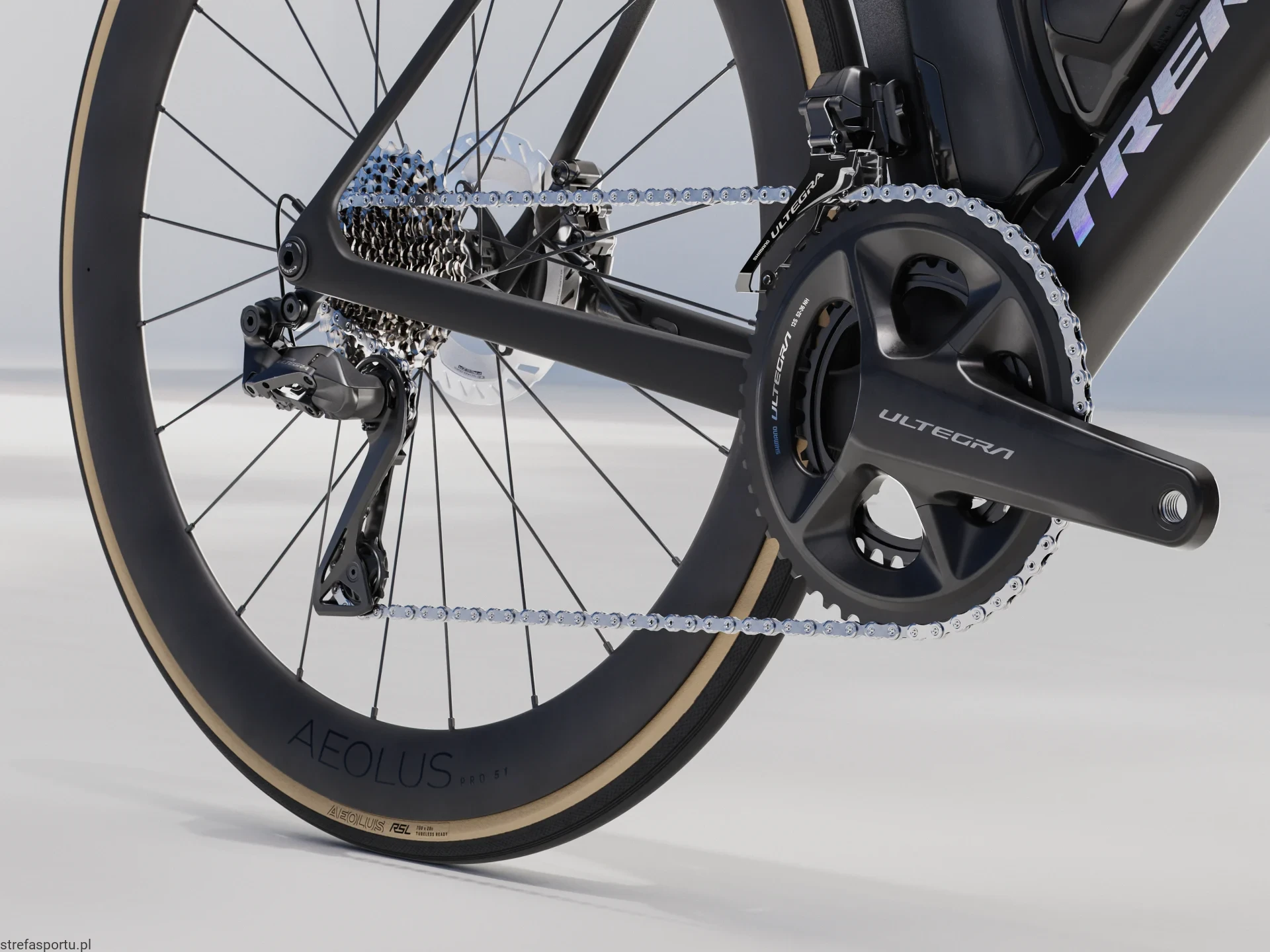 - Koło tylne Bontrager Aeolus Pro 51, włókno węglowe OCLV, przystosowane do zastosowania bezdętkowego Tubeless Ready, bębenek Shimano 11/12-rzędowy, sztywna oś przelotowa 142 x 12 mm