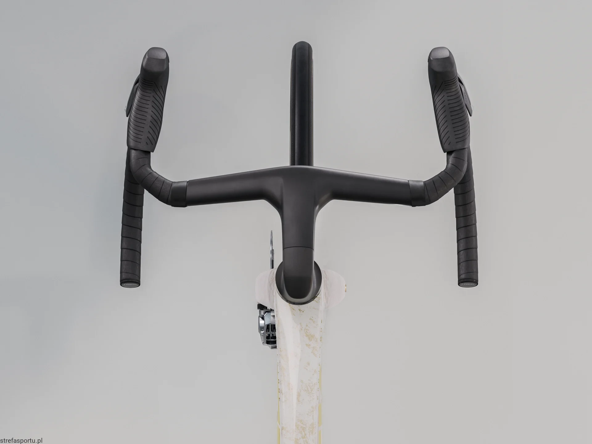 Zintegrowana kierownica/mostek Trek Aero RSL, włókno węglowe OCLV, dopasowanie wyścigowe, zasięg 80 mm, głębokość 124 mm, szerokość przy klamkomanetkach 41 cm, szerokość przy chwycie dolnym 44 cm, długość mostka 110 mm