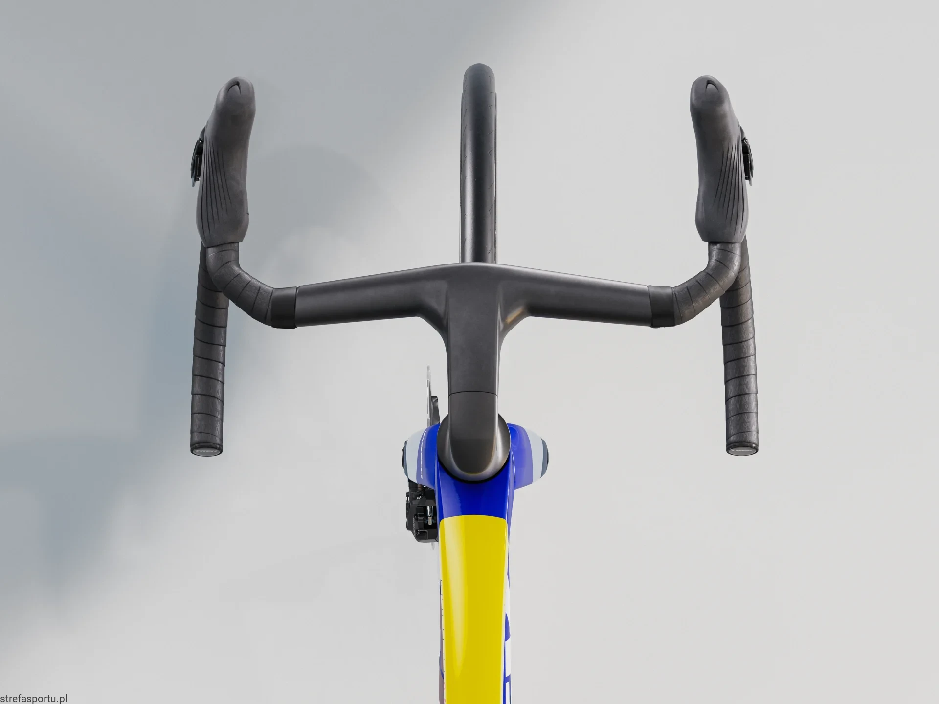 Zintegrowana kierownica/mostek Trek Aero RSL, włókno węglowe OCLV, dopasowanie wyścigowe, zasięg 80 mm, głębokość 124 mm, szerokość przy klamkomanetkach 41 cm, szerokość przy chwycie dolnym 44 cm, długość mostka 110 mm