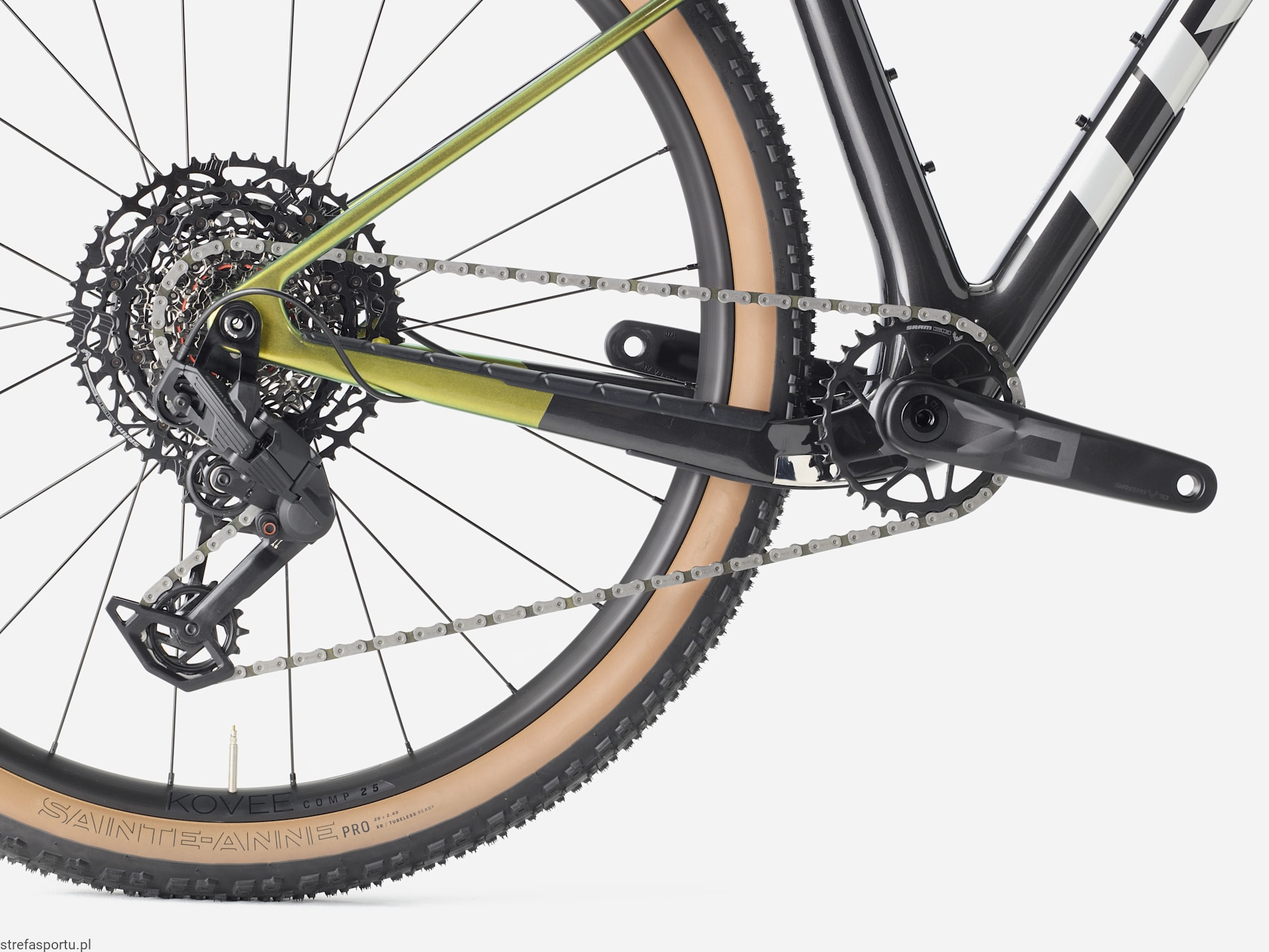 - Rama Włókno węglowe OCLV Mountain, IsoBow, zwężana główka ramy, wewnętrzne prowadzenie linek i przewodów, wyważone bezpośrednie mocowanie hamulca, Boost148