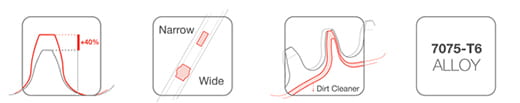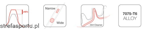 - Zwiększona wysokość zęba poprawia retencję łańcucha, gdy rower drży i drży