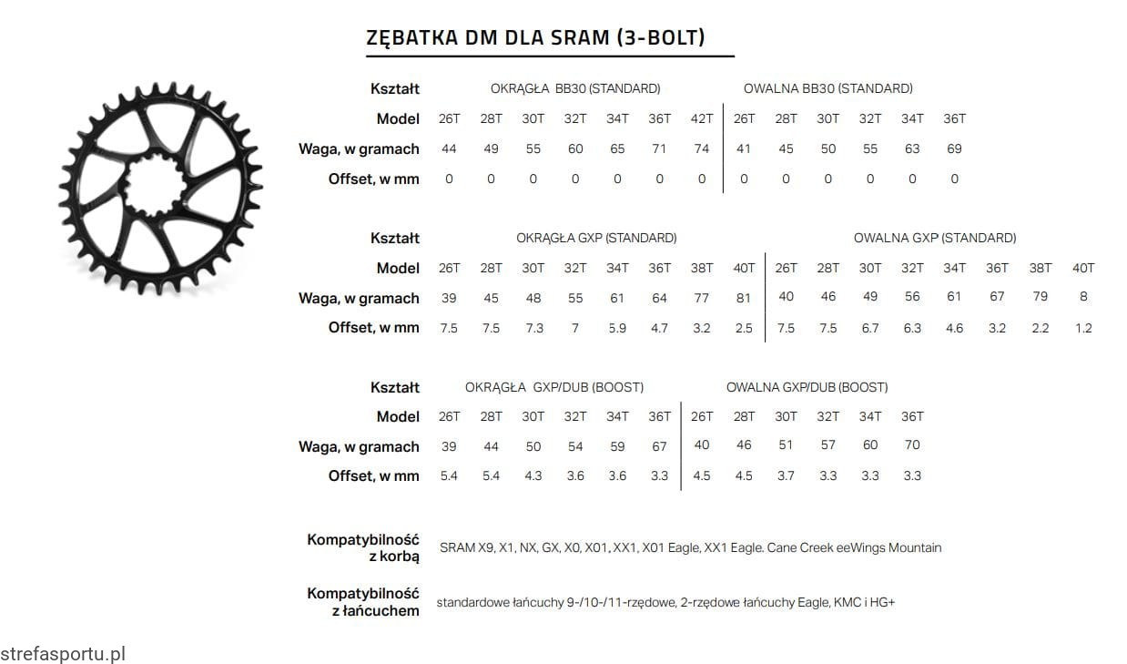 - Specjalny kształt zęba gwarantuje ściślejszy kontakt z łańcuchem i delikatniejsze pedałowanie (w porównaniu ze zwykłymi zębatkami)