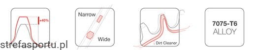 - Zwiększona wysokość zęba poprawia retencję łańcucha, gdy rower drży i drży