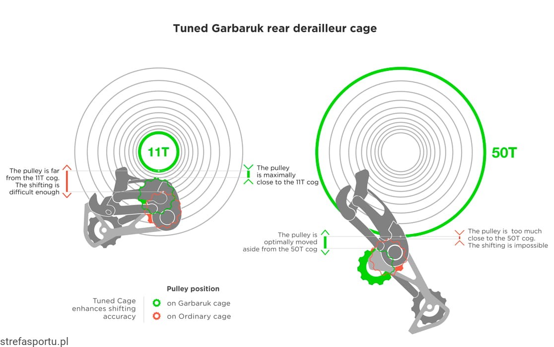 Z wózkiem Garbaruk do 11/12-biegowych tylnych przerzutek SRAM, możesz wycisnąć znacznie więcej osiągów ze swojego standardowego 11/12-biegowego napędu. Możesz teraz używać większych kaset do 52T(12rz) niż w standardowych wózkach przerzutek 11 i 12 rzędowych SRAM z większą precyzją i sztywnością.